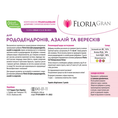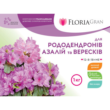 Гранульоване добриво Floria Gran для рододендронів, азалій та вересків виготовлено з високоякісної сировини, воно не містить важких металів та хлору. Це високоефективний препарат з повним набором макро- і мікроелементів, що стимулює активний ріст рослин, розвиток кореневої системи, підвищує імунітет рослин, покращує зимостійкість, сприяє утворенню великої кількості квіткових бруньок, гарантує рясне й тривале цвітіння.