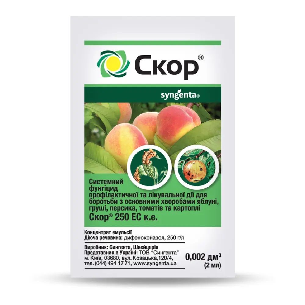 Фунгіцид Скор 250 ЕС, к.е. 2 мл – препарат системної дії для захисту плодових культур (яблуня, груша) від парші і борошнистої роси, персика від кучерявості листя, картоплю та томати від альтернаріозу, фітофторозу, а також моркви від альтернаріозу. Фунгіцид проти збудників хвороб має сильну лікувальну дію (5 днів) та профілактичну (8-10 днів).