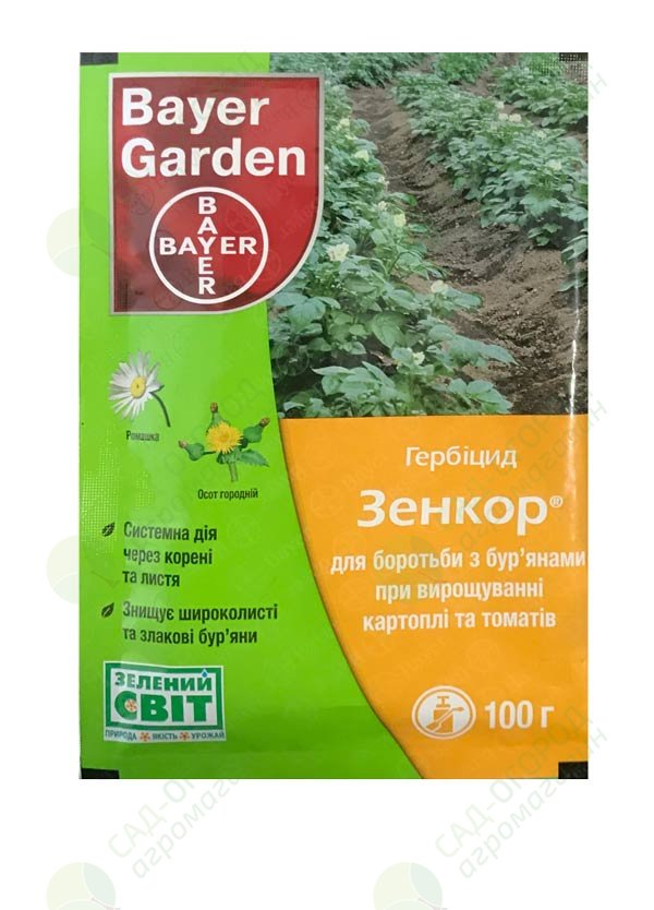 Зенкор 100 г – системний гербіцид для боротьби з дводольними та злаковими бур’янами, при вирощуванні картоплі, томатів, люцерни та сої. Раннє знищення бур’янів сприяє безперешкодному розвитку культурних рослин, в отриманні ними поживних речовин, води та світла.
