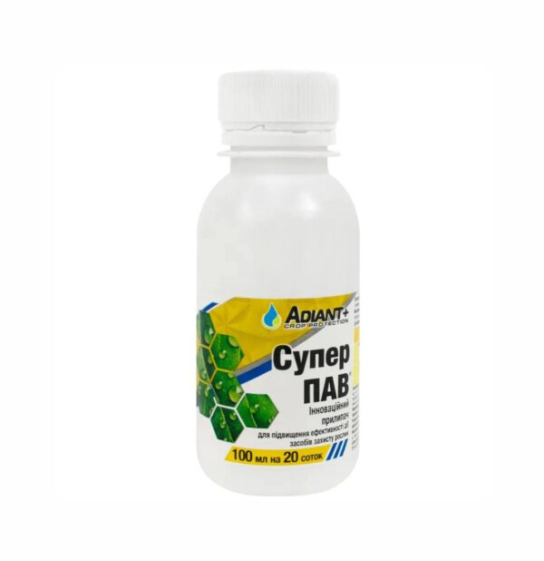 Прилипач Супер Пав 100 мл, Адіант+ – Універсальний прилипач Супер ПАР широко застосовується у бакових сумішах спільно з інсектицидами, фунгіцидами, гербіцидами, добривами та стимуляторами росту для обробки агрокультур з метою рівномірного розподілу та утримання робочого розчину на поверхні рослини.