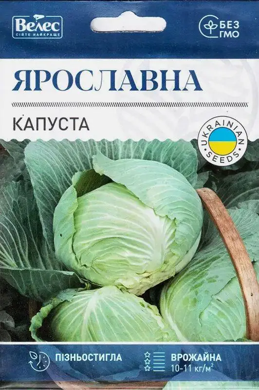 Насіння капусти Ярославна 5г – Сорт пізньостиглий (160-175 днів), високоврожайний, стійкий до розтріскування. Дозріває на 10-15 днів пізніше стандартного сорту Амагер-611. Головка плоско-округла, щільна, в розрізі біла, масою 3,5-4 кг. Товарність плоду дуже висока, до 99,6%. Універсального призначення. Транспортабельність висока. Має відмінні засолювальні якості. Холодостійка, волого – світлолюбна культура. Вирощують розсадним або безрозсадним способами.