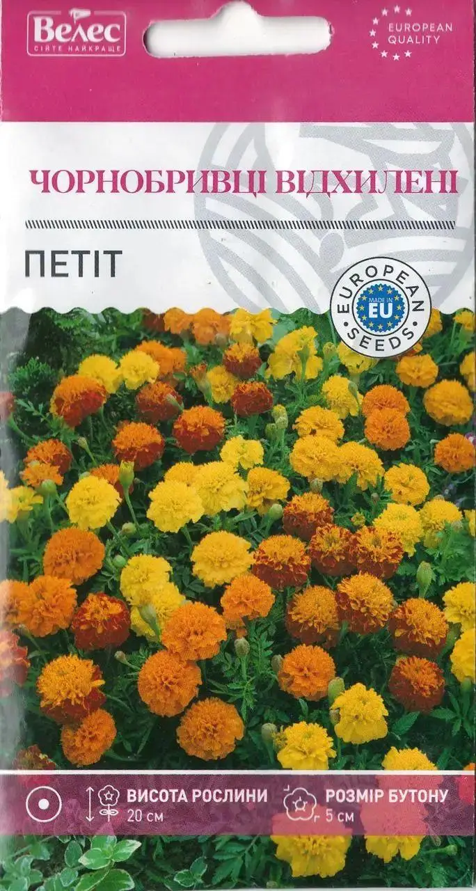 Чорнобривці розлогі Патит, жовті (Tagetes patula nana double Petite, yellow) – однорічна, компактна рослина висотою 15-20 см, має вигляд круглого кущика. Широко використовують для клумб, рабаток, горщика, озеленення балконів, яскравих груп на газонах. Сорт густоветвистий, з прямими і міцними пагонами. Листочки середньої величини, ясно-зелені. Суцвіття великі, 3,5-5 см в діаметрі яскравого забарвлення. Цвіте дуже рясно з червня до заморозків. Насіння висівають у березні – квітні у парники або у кінці квітня у відкритий грунт. Сходи з’являються на 3-8 день. У відкритий грунт розсаду висаджують у травні після закінчення заморозків, на відстані 20-25 см. Легко витримує пересаджування. Дуже швидко зростає. Рослина до грунту і вологи не вибаглива, але добре росте на легких родючих грунтах. Жаро – і посухостійка. Любить сонячні місця, але добре цвіте і в півтіні. Заморозків не витримує.