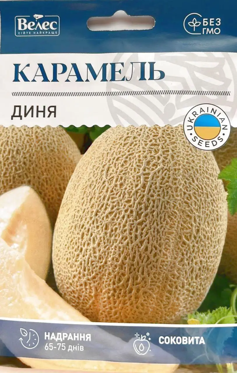 Насіння дині Карамель 5г Ранньостиглий урожайний сорт «ананасного» типу. Вегетаційний період від сходів до технічної стиглості 65-75 днів. Плоди овальної форми, масою 2-2,5 кг, жовтого кольору з яскраво вираженою крупною сіткою на шкірці. М’якоть біла, соковита, дуже солодка і ароматна. Цінність сорту: стійкість до фузаріозу та стабільне формування плодів навіть в стресових умовах. У північних районах рекомендується вирощувати через розсаду.