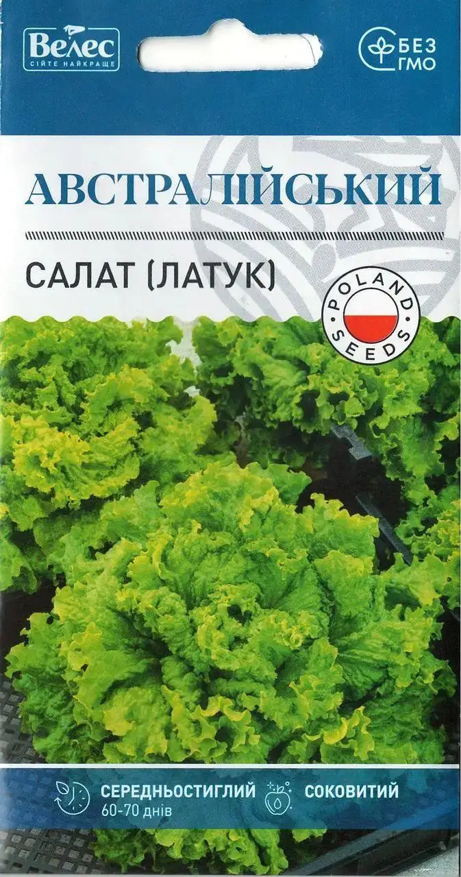Насіння салату Австралійський 1г Середньостиглий, полукочанный сорт. Вегетаційний період від сходів до технічної стиглості 60-70 днів. Качани рихлі, масою 300-350г, світло-зеленого кольору, високих смакових якостей. Листя кучеряві, хрусткі і соковиті. Рекомендується для вирощування у відкритому ґрунті і плівкових укриттях. Використовується для споживання у свіжому вигляді.