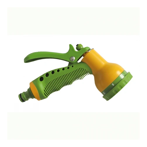 Пістолет з фіксатором безперервного поливу. Ергономічна ручка з заглибинами під пальці. 7 режимів поливу: центр, конус, плоский, струмінь, душ, туман, підливання. Зміна режиму роботи простим поворотом головки. Пістолет використовується для ручного поливу газонів середньої та невеликої площі, городів, квітників, прибирання доріжок на прибудинковій території, миття садового інвентаря та техніки. Підключається до садових шлангів за допомогою конекторів. Рекомендований робочий тиск в системі від 2 до 4 атмосфер. Виготовлений з якісного матеріалу ABS+PP+TPR, стійкий до механічних пошкоджень, впливу ультрафіолету і водорозчинних добрив. Інструкція по підключенню пістолета: підключити садовий шланг через кран до джерела водопостачання, за допомогою конектора (з аквастопом) підключити шланг до пістолета, вибрати необхідний режим поливу, увімкнути пістолет натисканням на курок.