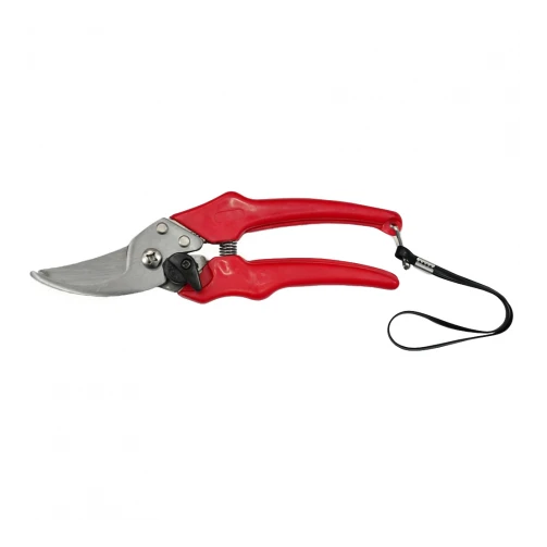 Ручний обвідний секатор з верхнім робочим лезом загальною довжиною 210 мм призначений для роботи з квітами на клумбі, підрізання тонких живих гiлок дерев та кущiв в саду. Леза виготовлені із сталі без покриття, косий зріз, діаметр зрізу до 15 мм, зручний боковий пластиковий фіксатор, дротова пружина, пластикова полегшена рукоятка для невеликого об’єму робіт в саду. Можливо працювати правою та лівою рукою. Додатковий ремiнець для фiксацiї секатора на зап’ястi.