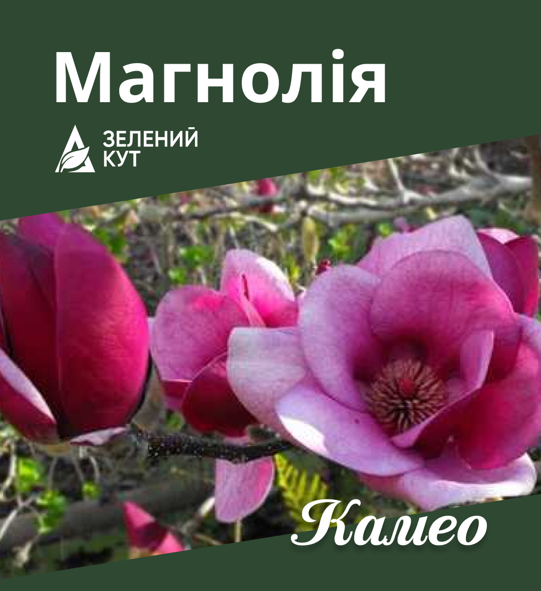 Магнолія Суланжа ‘Cameo’ (Камео) – сорт відрізняється повільним ростом, досягаючи 3-4 м у висоту та до 1 м в ширину. Весною Камео вражає пишним цвітінням, вкриваючись пурпурно-ліловими бутонами, що нагадують витончені тюльпани. З них розкриваються великі, розкішні квіти: червонувато-фіолетові зовні та ніжні, білі з червоними тінями всередині.